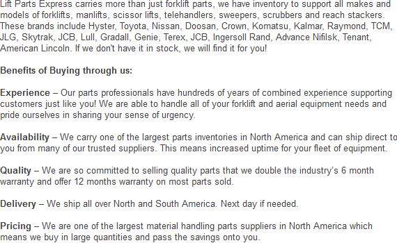 We offer you the best prices on all parts for your fleet of forklifts. Call now to get a price quote on one of the parts or attachments we offer. We can be reached at:
